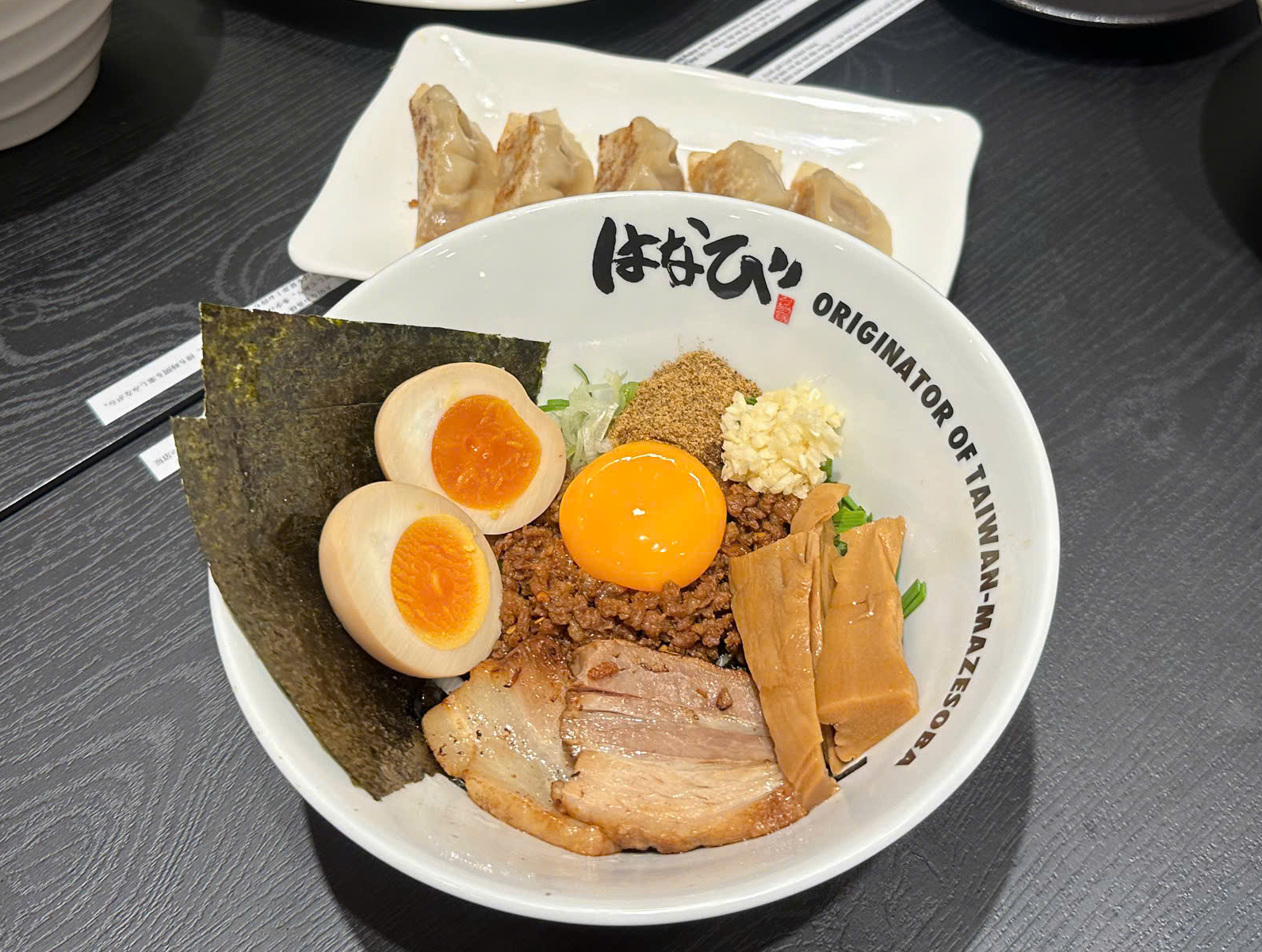 Menya Hanabi, originally founded in Nagoya, Japan, is renowned as the birthplace of Taiwan Mazesoba—soupless mixed noodles that have gained international recognition for their bold flavors and unique dining experience. Each bowl features spicy minced pork, garlic chives, green onions, seaweed, fish powder, raw egg yolk, and thick noodles, carefully mixed before eating. To complete the meal, rice (Shime-Gohan) is added to the remaining sauce, offering a second way to enjoy the dish.